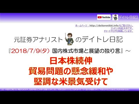 ☆タイトル:18/7/9夕 日本株続伸 貿易摩擦緩和と堅調な米経済と株価の影響を受けて