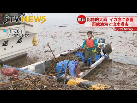 きのう、24時間降水量が統計開始以来最多の145ミリを記録した北海道・函館市。その影響で函館漁港を大量の流木が覆い、イカ漁に影響が出ています。(2022年8月10日放送)
